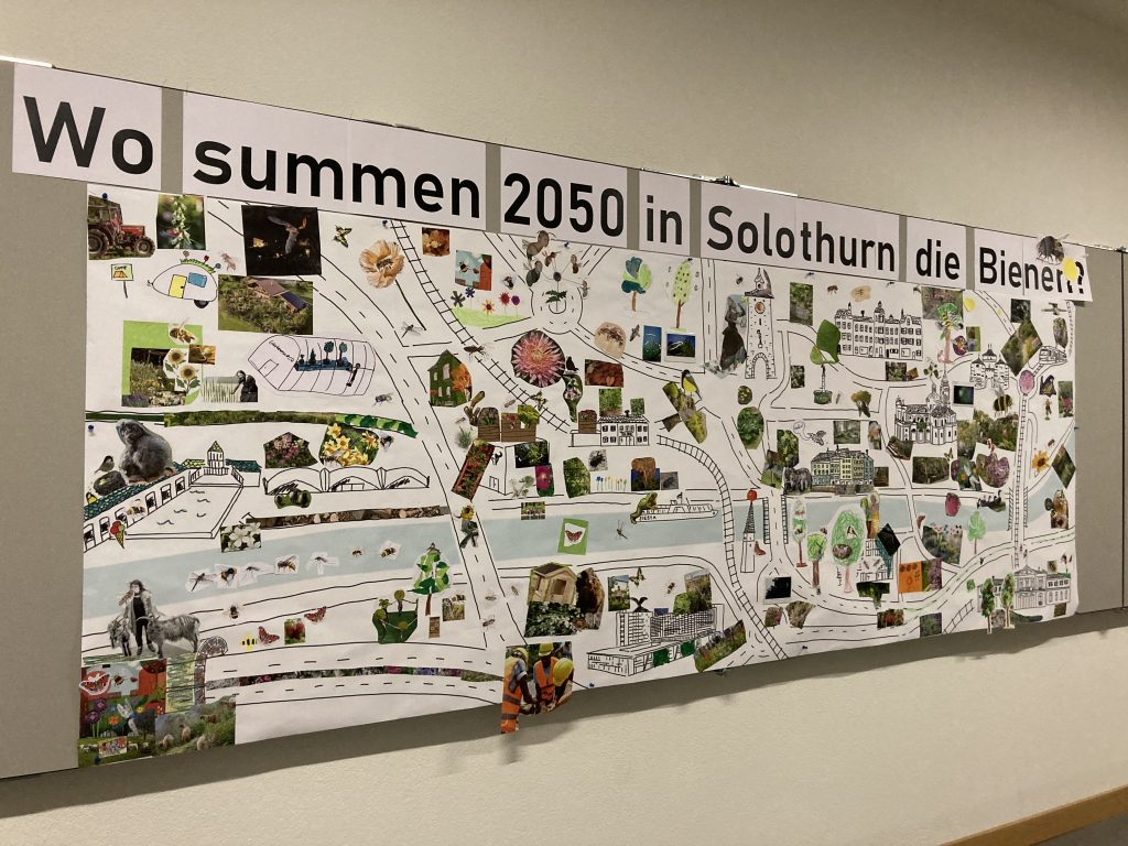 Ausgehend vom Realexperiment «Camera Natura» wird im Mitmach-Angebot «Wo brummen 2050 in Solothurn die Bienen?» gemeinsam eine Collage der Stadt der Zukunft erstellt: Gemüsegärten auf den Dächern? Eine Bienenweide auf dem Amthausplatz? Fliegende Elektroautos? Gemeinsam kreieren wir in einer grossen Collage eine bildhafte Vorstellung einer artenvielfältigen Zukunft für Mensch und Natur. Lass dich von verschiedenen Bildmaterialien inspirieren und gestalte die Stadt so mit, wie du sie dir für die Zukunft wünschst.
